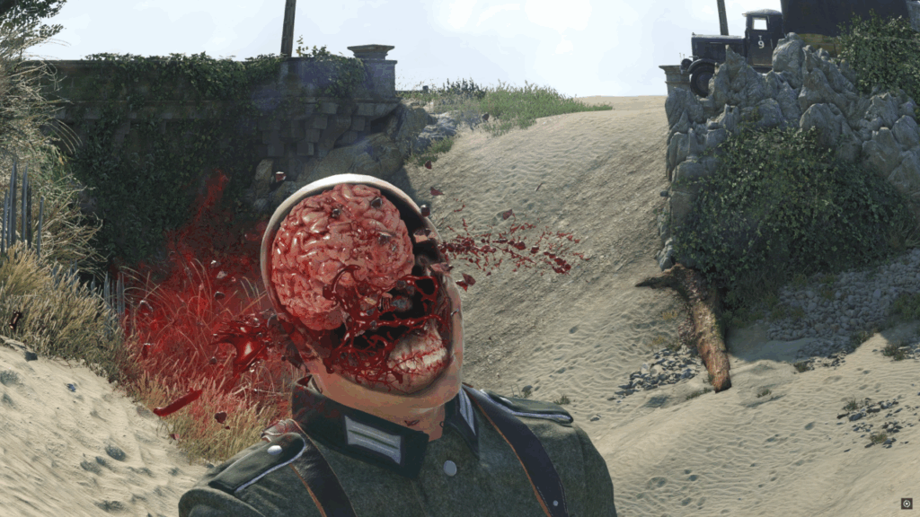 発射された弾丸が飛翔するさまをスローモーションで見せ、弾丸がドイツ兵に命中したらX線で透過したビューを用いて弾丸が臓器をどのように破壊し、死に至らしめるかを描写する。