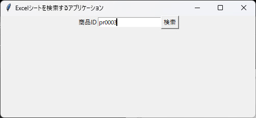 上記Pythonのコードを実行すると以下のウィンドウが表示されますので「商品ID」欄に、保存済みのExcelシートに存在する値を入力してから「検索」ボタンをクリックします。