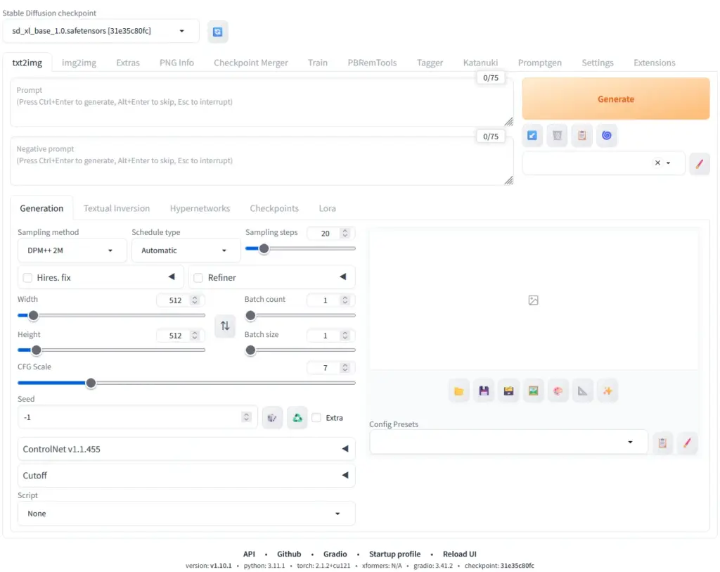 txt2imgタブの中に「Config Presets」の項目が追加されていることがわかります。以上で「Config Presets」の導入は完了です。