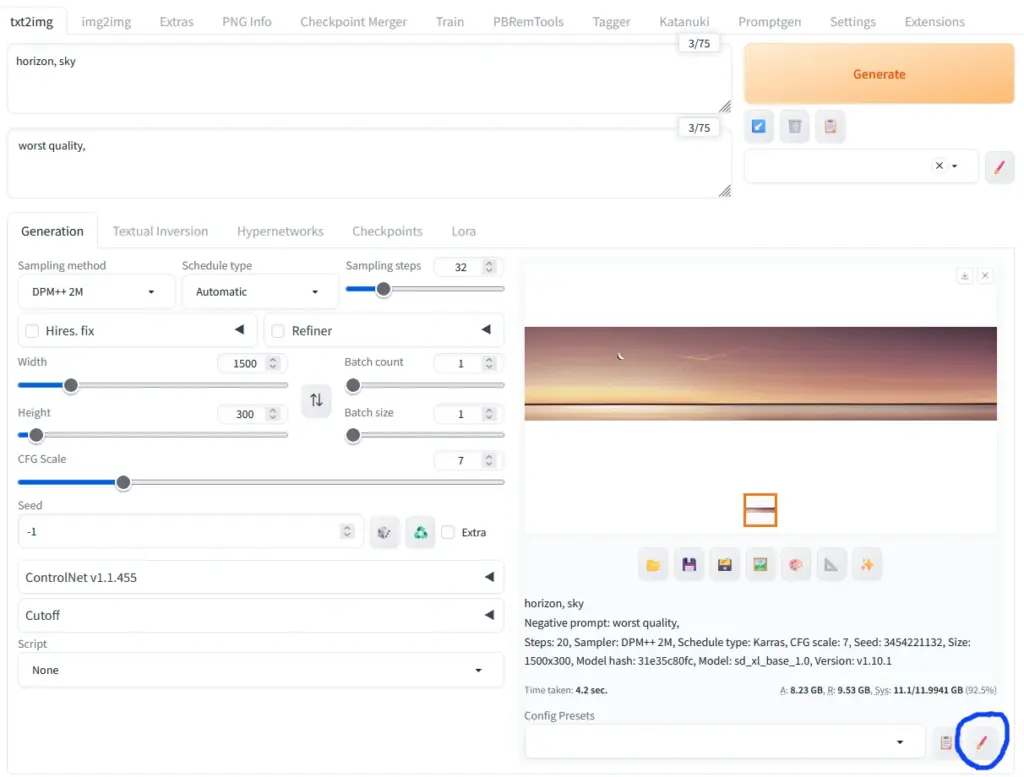 適当な画像を生成してみました。このプロンプトと設定を保存してみます。Config-Presetsのペンのボタンをクリックします。